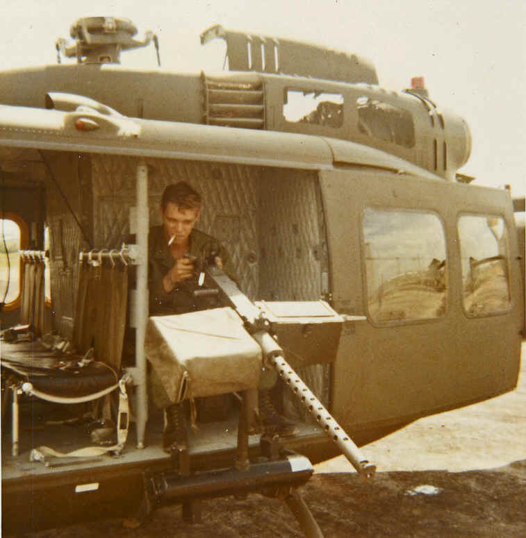 The UH-1 itself usually carried two 7.62mm M60 type machine guns, one mounted in each two-man compartment on the sides of the helicopter. These were operated by the crew chief and one other person who was assigned to that machine. These guns were swivel mounted on a fixed arm that was attached to the sides of the helicopter just below the sliding doors. The rifle type stock that was used by ground troops and the scout gunners was replaced by a side by side two-handed grip and a "butterfly" type trigger assembly.