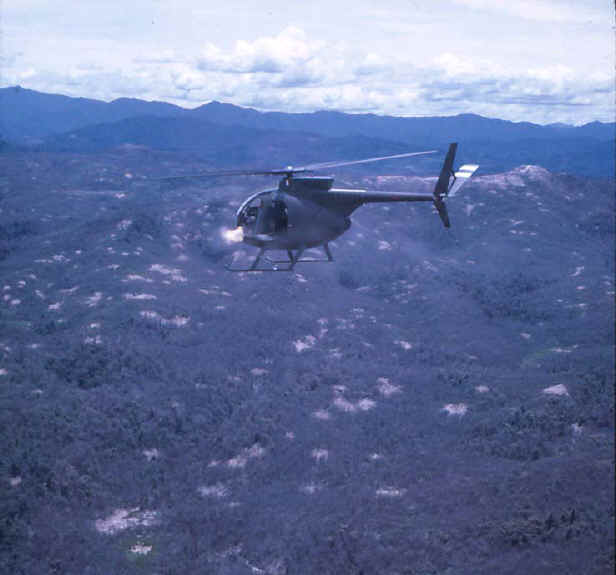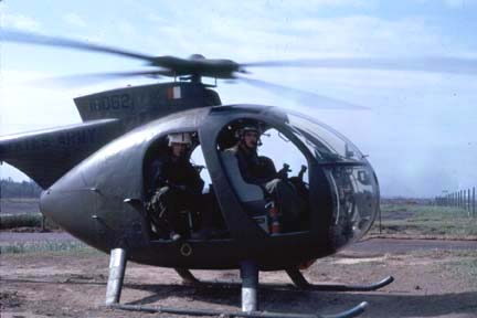 In about February of 1970, while the unit was still working out of Tay Ninh, Mike Foster thought it would be good to have a set of rockets installed on an OH-6. The idea looked good "on paper", so Keith Zuhlke and Tony Wassmer added a rocket pack to the left side of a Cayuse and built a switching system for selecting and firing the rockets. Mike and Ken Gardiner took the helicopter out a couple of times to test the unit, and the combination was used several times before the helicopter returned one day with a badly pitted bubble. Rumor has it that there were no other volunteers to fly that OH-6 after that. Though there were times when the rockets were quite effective, it was felt that the mini-gun was better when a quick response was needed. This combination suffered the same fate as the one installed on the OH-13 in 1968.