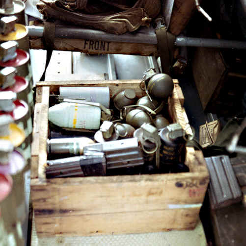 A number of grenades were also carried in the scout ships. These consisted of regular explosive, white phosphorus, incendiary, CS and four different colors of smoke. While most of these were carried in a .50 caliber ammunition container that was stored between the seats, others were often found hanging on the defroster cable or even on safety wire that was attached to some part or other of the firewall. It was a matter of choice of a particular crew as to where these were stored and how many they tried to get the poor old OH-13 to lift.