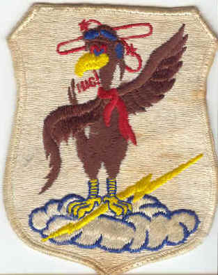 The bird is a buzzard, which likes to fly in search of prey. This, and the red scarf which was worn by the scout crews around this same time, represents the scouts. The lightning bolt and the cloud represent the Command and Control aircraft high overhead.