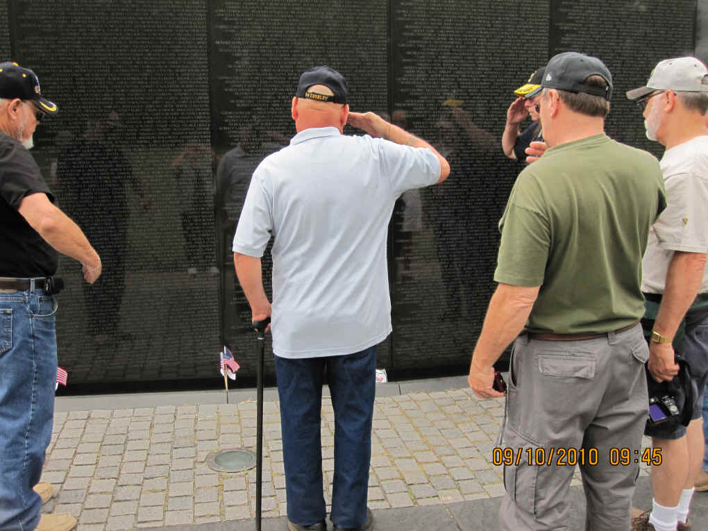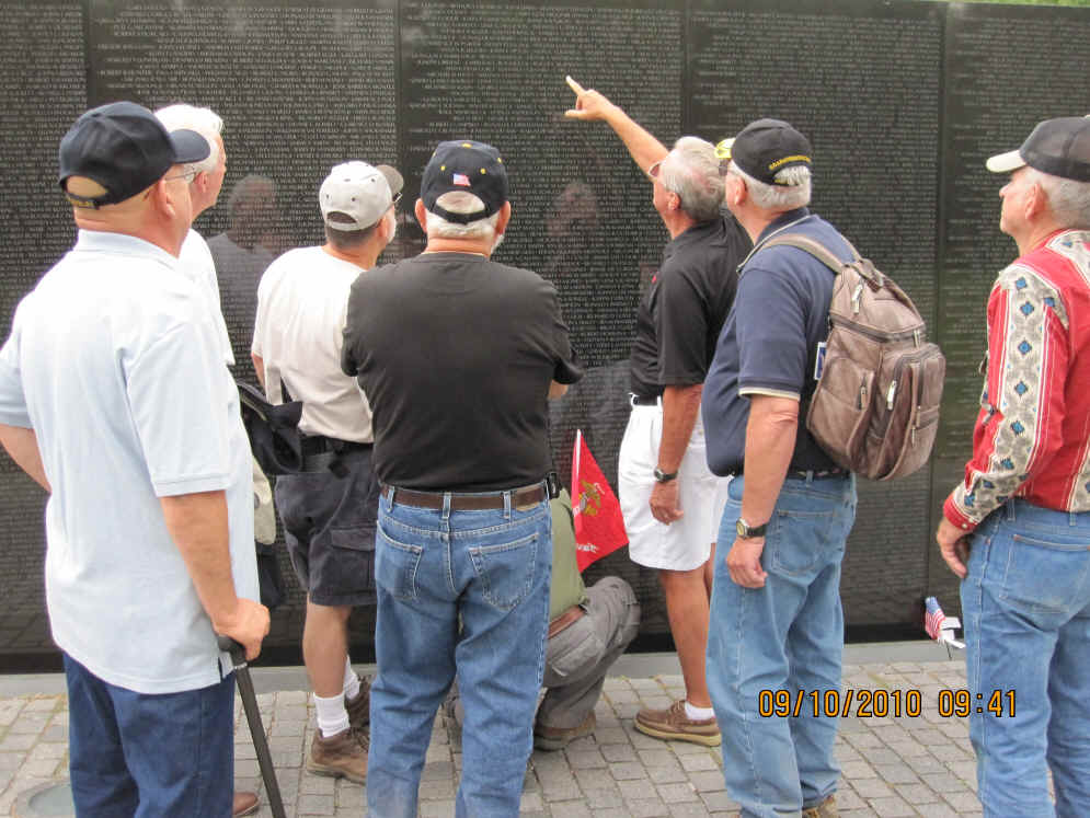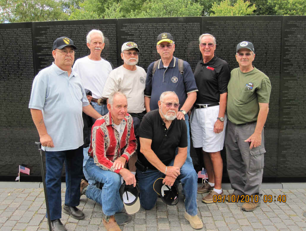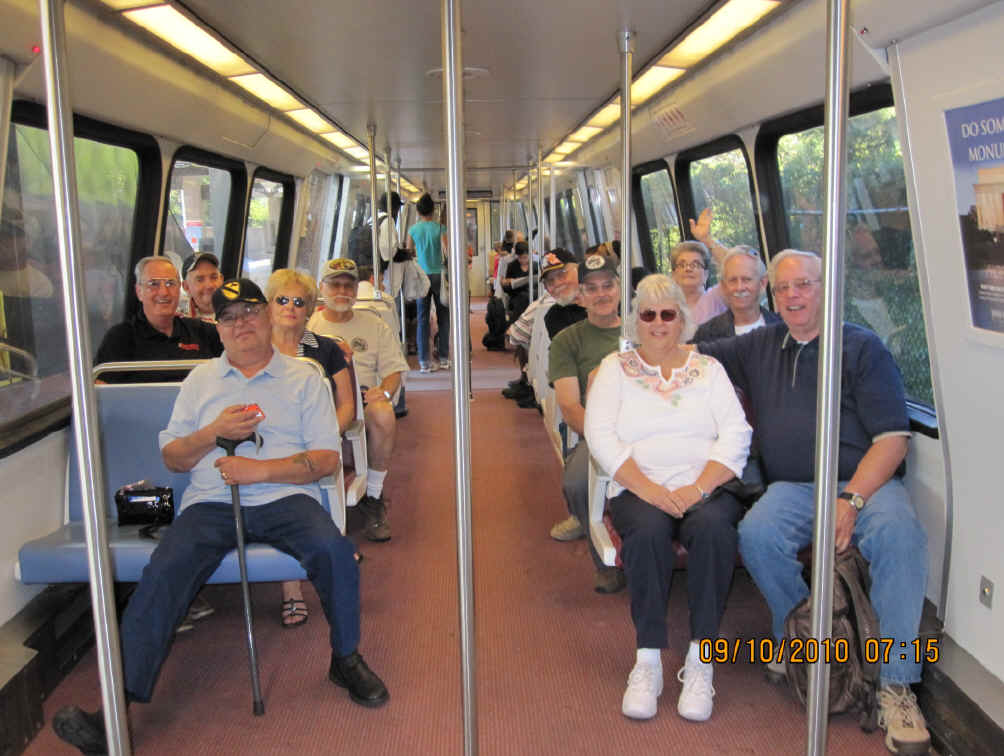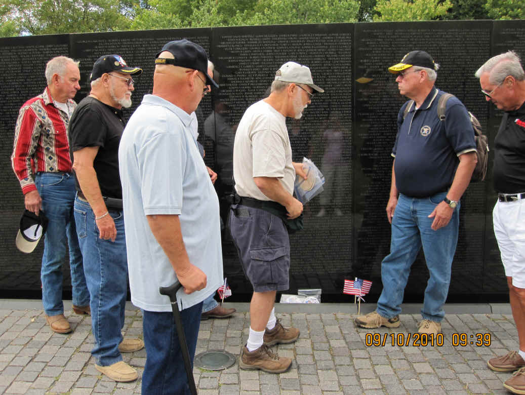 September 10, began with a breakfast pre-mission briefing prior to assaulting the Fairfax, Vienna Metro station for a trip downtown minus Gomer (who drove himself and missed the rest of us in DC) and Cowboy (who previously worked in DC and didn’t need to see this stuff again). After debarking at the Smithsonian Metro Station, we marched (route step) to the World War II Memorial and then on to The Wall. Sam Estes had prepared several Flying Circus Scout patches for all of us to sign and leave in respect for six fallen Flying Circus members enshrined there: Art Crosby (Chicken Man), Gregory A. Marvin (Tiny), John Berry (Mister Clean), Gaylord Kerr (Red), Billy K. Evans, and Richard T. Williams (Harry). At The Wall we met a large number of brother Vietnam veterans and exchanged pleasantries. We later divided forces with some of us going to the National Air and Space Museum mall facility and the balance visiting the Lincoln Memorial, the Korean War Memorial, the Roosevelt Memorial, and the Jefferson Memorial. The arrival of Bruce Brattain (Batman) and his significant other Debbie Scott completed the balance of the Flying Circus 2010 Reunion attendees. That evening the unit then travelled to the Olive Garden mess hall for a quality food event and good fellowship. The evening planning session was held at the Flying Circus Club on the patio of the hotel.